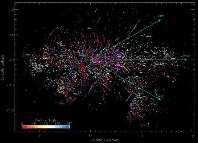 Yusef-Zadeh表示,包括他自己在内的研究人员一直忙于研究巨大的垂直丝状物结构的本质,以至于几乎没有人注意到还存在着可以追溯到银河系中心的较短的水平丝状结构。
