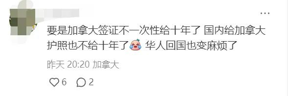也有人担心,“要是加拿大签证不一次性给十年了 国内给加拿大护照也不给十年了,华人回国也变麻烦了。”