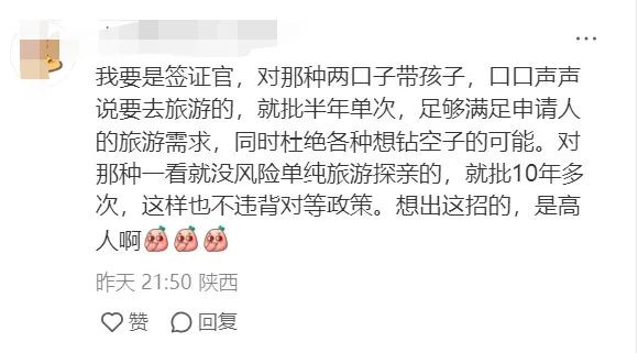 还有人这样说:“我要是签证官,对那种两口子带孩子,口口声声说要去旅游的,就批半年单次,足够满足申请人的旅游需求,同时杜绝各种想钻空子的可能。对那种一看就没风险单纯旅游探亲的,就批10年多次,这样也不违背对等政策。想出这招的,是高人啊。”