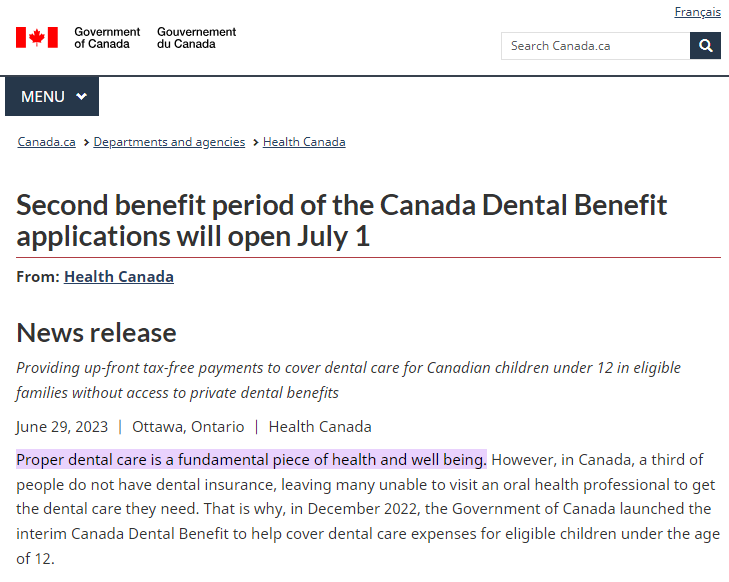 加拿大政府史上第一个全民牙医福利计划(Canada Dental Benefit)从去年12月1日开放申请,为12岁以下且家庭年收入低于 $90,000 的儿童提供补助金。