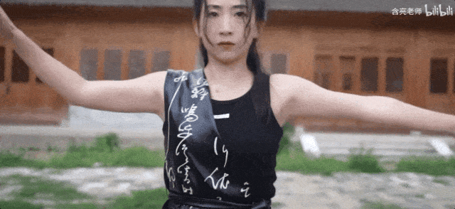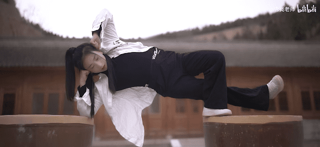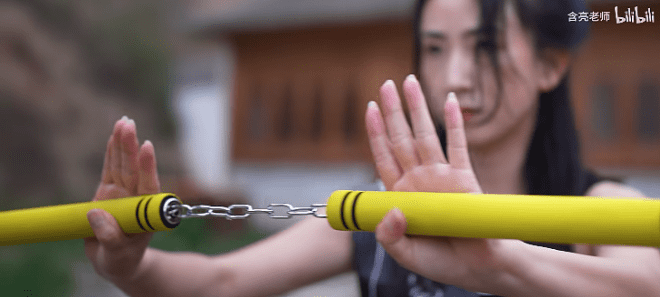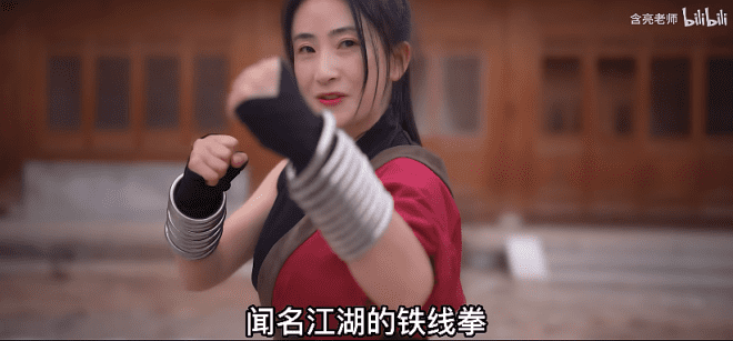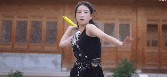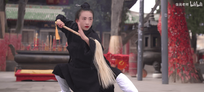 只见视频中,她一身黑衣上场,用一套双截棍的组合拳,致敬李小龙先生。