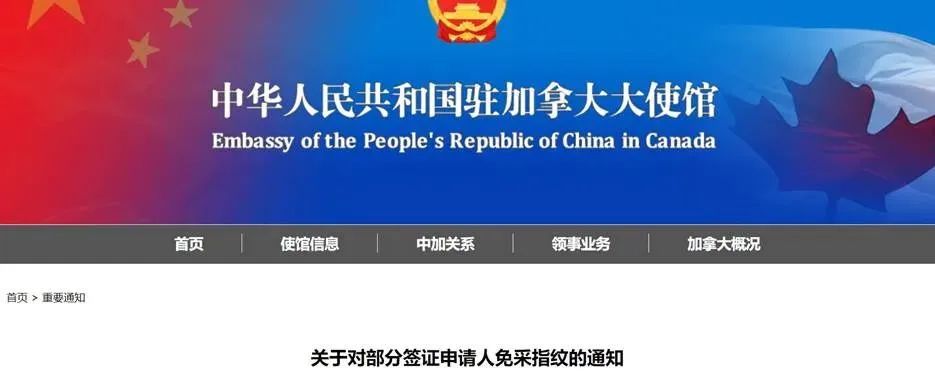 通知指出,自2023年8月9日起至2023年12月31日,驻加拿大使领馆对符合条件的一次或两次入境的商务、旅游、探亲、过境、乘务类签证申请人免采指纹。