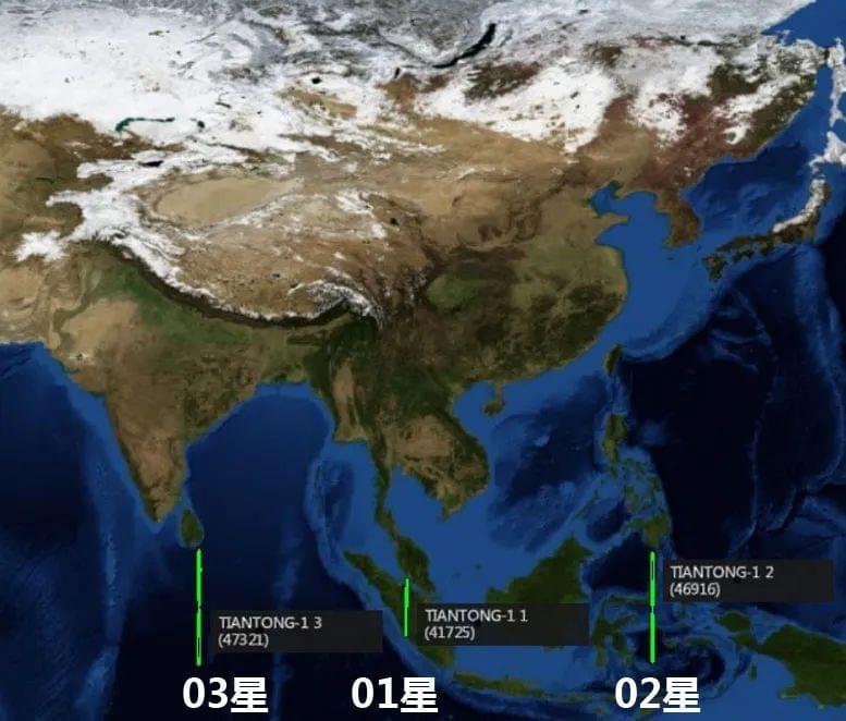 天通一号卫星系统目前有三颗在轨卫星:01星、02星和03星。三颗卫星均为地球同步轨道,位于赤道上空,距离约36000公里。