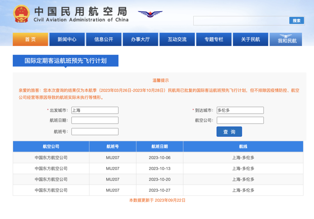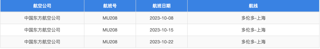 可以看到东方航空每周从上海到多伦多只有一班飞机。而从多伦多前往上海的就更少了。