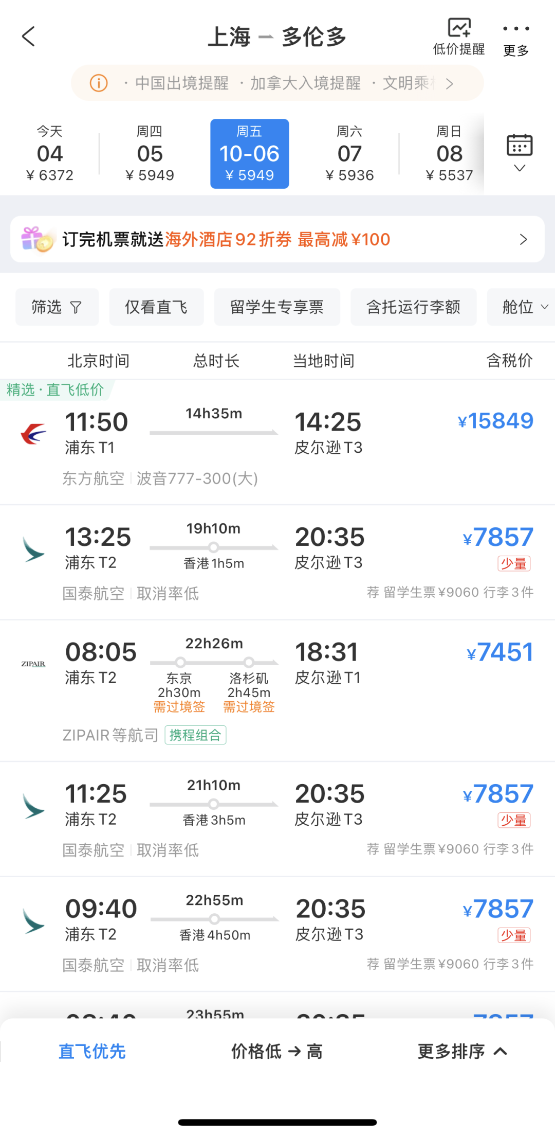 可以看到现在上海到多伦多直飞目前只有东方航空一条航线。价格为1w5左右,而且这还是单程的价格。