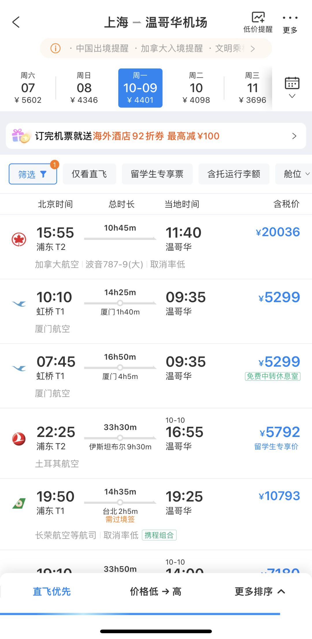 而从上海直飞温哥华的航班也是只有加航一条航线,单程价格更是高达2w。
