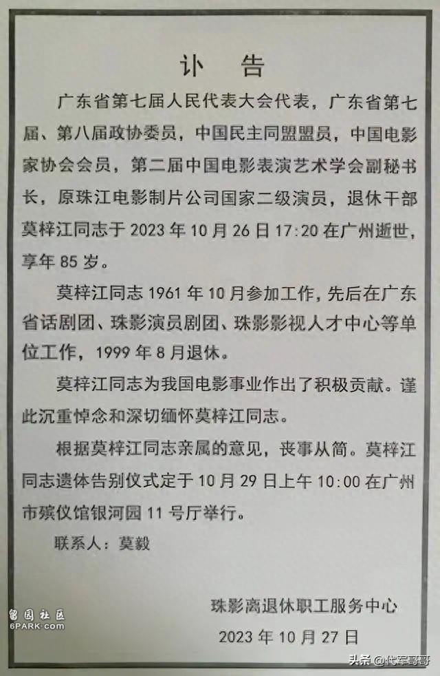 10月27日,珠江电影制片厂离退休职工服务中心发布讣告,中国电影家协会会员、第二届中国电影表演艺术学会副秘书长、原珠江电影制片公司,国家二级演员莫梓江于10月26日17:20在广州去世,享年85岁,他曾经在长春电影制片厂拍摄的电影《五朵金花》中扮演男主角阿鹏被广大观众所熟知。