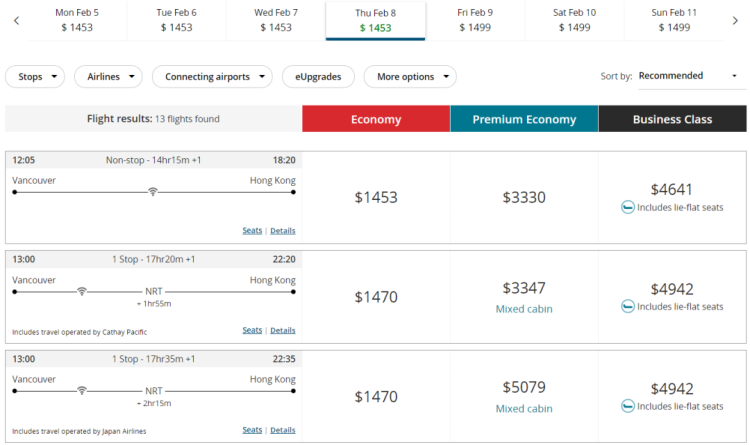 目前,加航官网搜索到春节前后几天直飞香港的航班机票,价格保持在1400加元左右,与新历年期间的票价对比,略有下降。