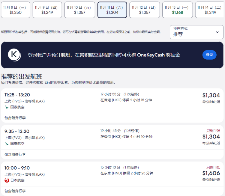 在去哪儿平台上,上海-洛杉矶的机票价格由年初的1.5万元人民币,降至暑期1万元人民币,9月降至8000元人民币左右,目前查看11月价格已降至7000元人民币。