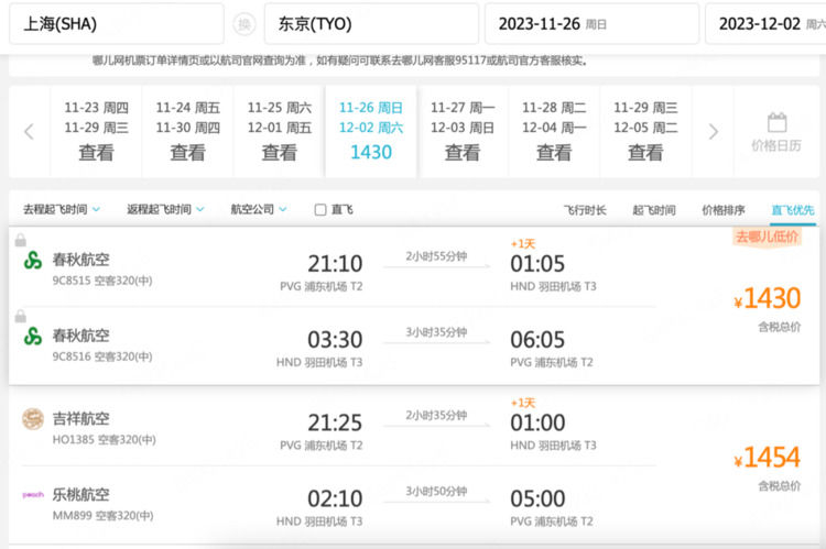 而随便翻一下订票平台,以目前11月份的价格来看,东京-上海、东京-天津、东京-宁波等国内主要城市之间的往返机票价格,即便算上税,也不过1500元人民币左右。