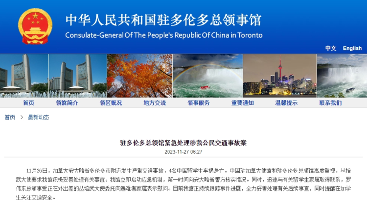 在11月26日,加拿大安大略省多伦多市附近发生严重交通事故,4名中国留学生车祸身亡。
