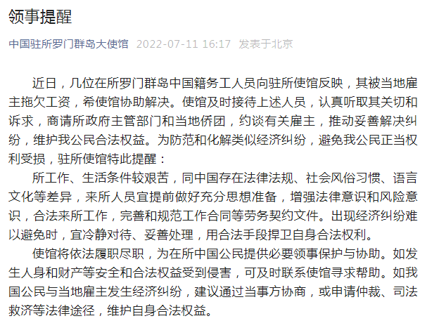 针对中国公民务工问题,驻所使馆表示, 所罗门的工作、生活条件较艰苦,同中国存在法律法规、社会风俗习惯、语言文化等方面的差异。