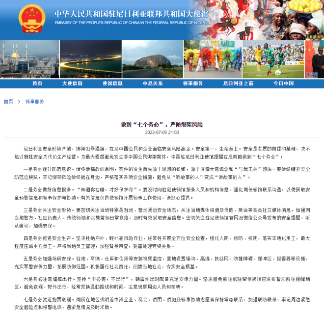 7月5日,中国驻尼日利亚大使馆表示,当前,尼日利亚安全形势持续复杂严峻,在尼中国企业和人员面临安全风险不断走高,涉中国公民安全案件连续发生。