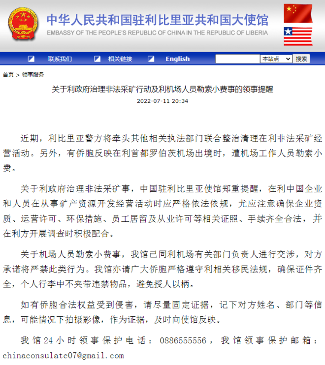 中国驻利比里亚大使馆近日提醒当地中国公民切勿从事非法采矿等活动。近期,利比里亚警方将牵头其他相关执法部门联合整治清理在利非法采矿经营活动。