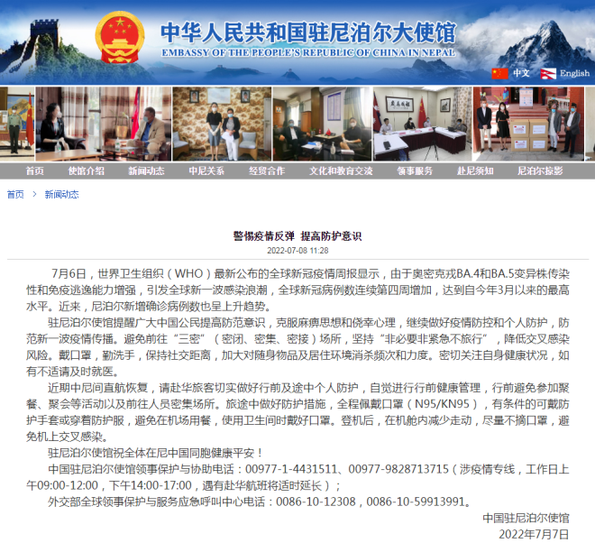 7月8日,中国驻尼泊尔大使馆发文称尼泊尔新增确诊病例数呈上升趋势,因此,当地中国公民应避免前往“三密”(密闭、密集、密接)场所,坚持“非必要非紧急不旅行”,降低交叉感染风险。同时,还须密切关注自身健康状况,如有不适请及时就医。