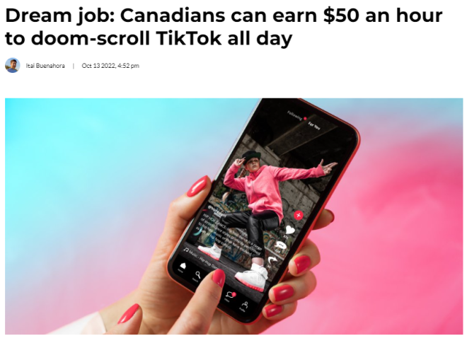 Ubiquitous是一家TikTok网红营销服务公司,希望支付每小时50加元的报酬,找人在TikTok上狂看12小时的视频。这12个小时可以分散在三天内完成,所以不用担心一天看太长时间。