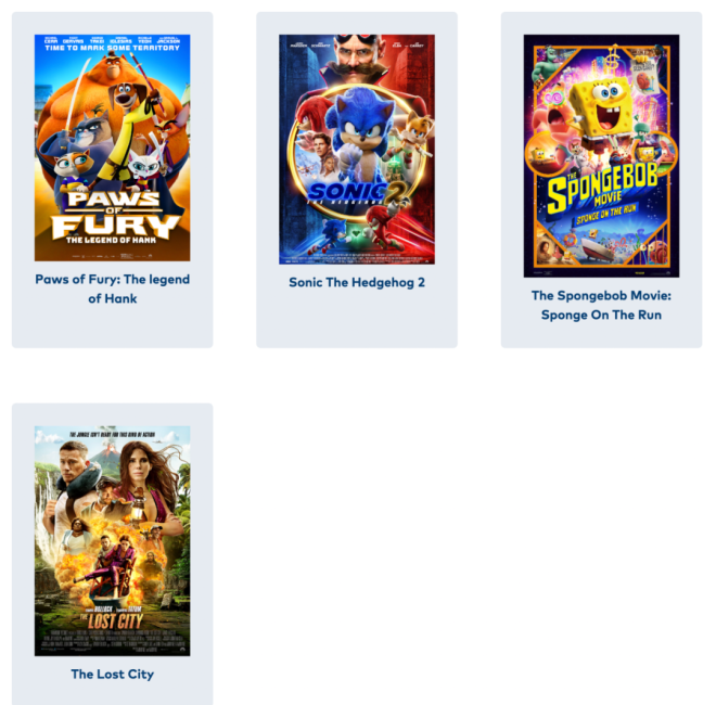 前三部应该是小朋友比较喜欢的合家欢电影,最后一部The Lost City是由Sandra Bullock和Channing Tatum主演的动作喜剧探险类大片,大家可以冲一波!