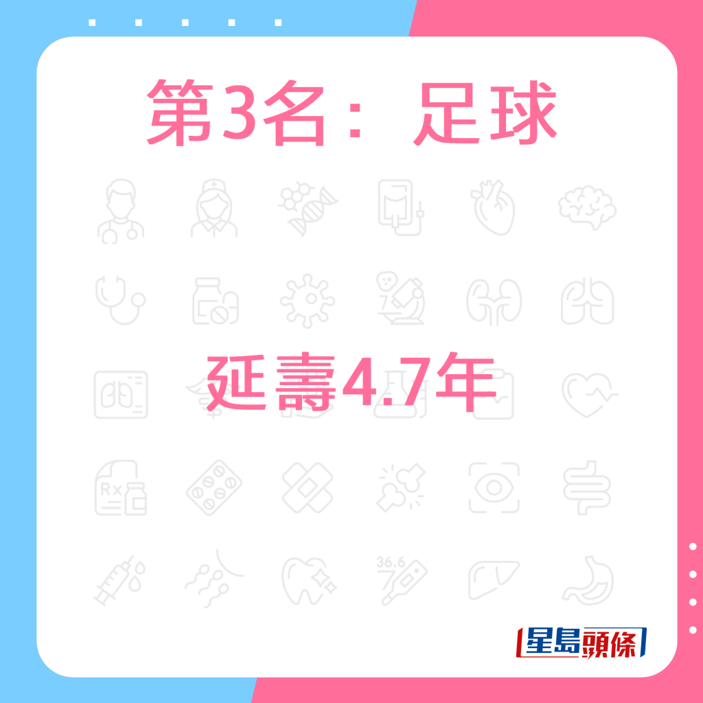 上述研究结果已于医学期刊《梅奥诊所学报》(Mayo Clinic Proceedings)发表。研究人员曾对哥本哈根市8,577名,年龄由20至93岁之间的参与者,进行从1991年至2017年长达约25年的追踪调查。结果发现,与久长不做运动的人相比,做运动的确能延长寿命。而且不同种类的运动所延长的寿命也有所不同,研究人员更指出如果与伙伴一同做运动,效果比独自做更好: