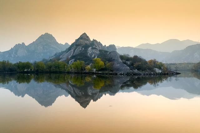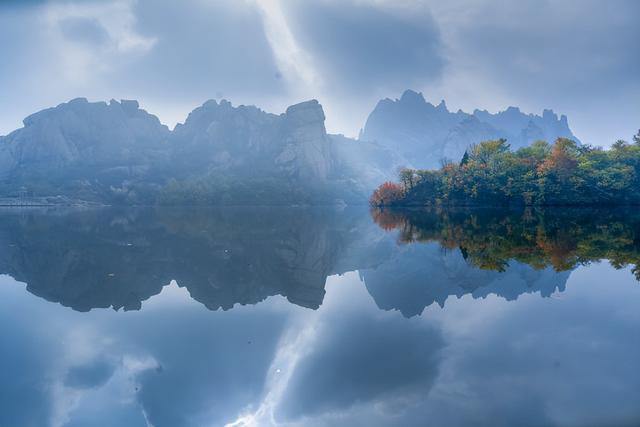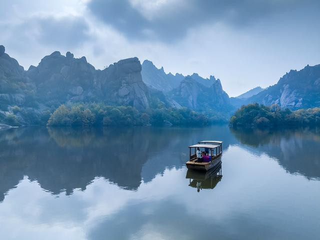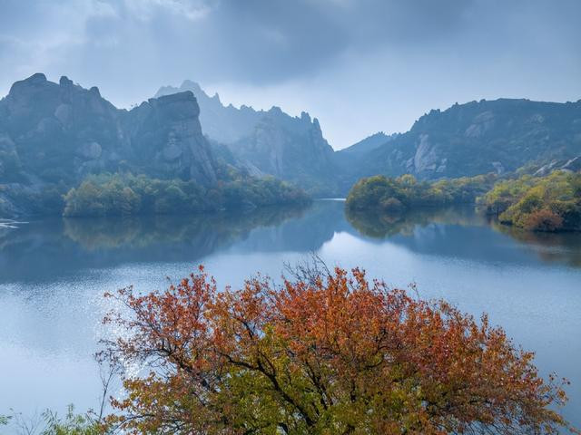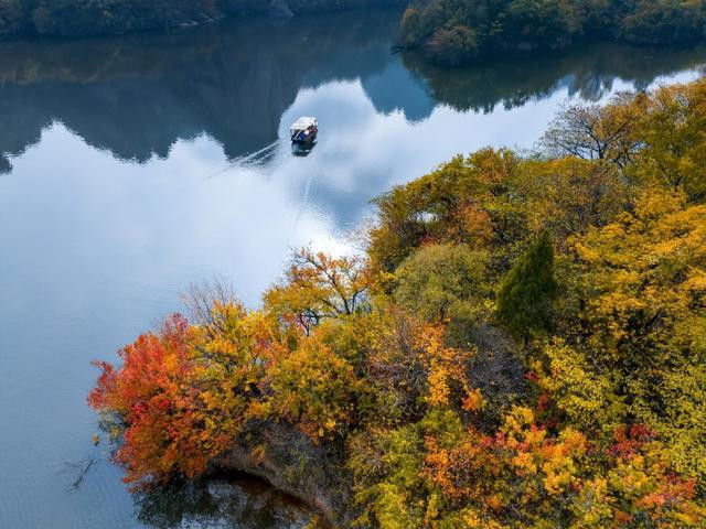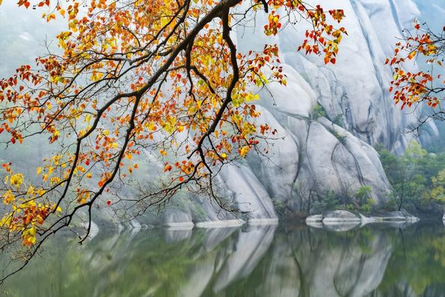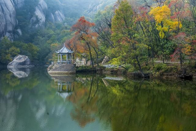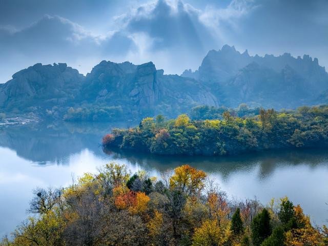 在河南驻马店的嵖岈(cháyá)山风景区,树木五彩斑斓,远处层峦叠嶂、近处水天一色,犹如一幅梦幻的水墨画卷。