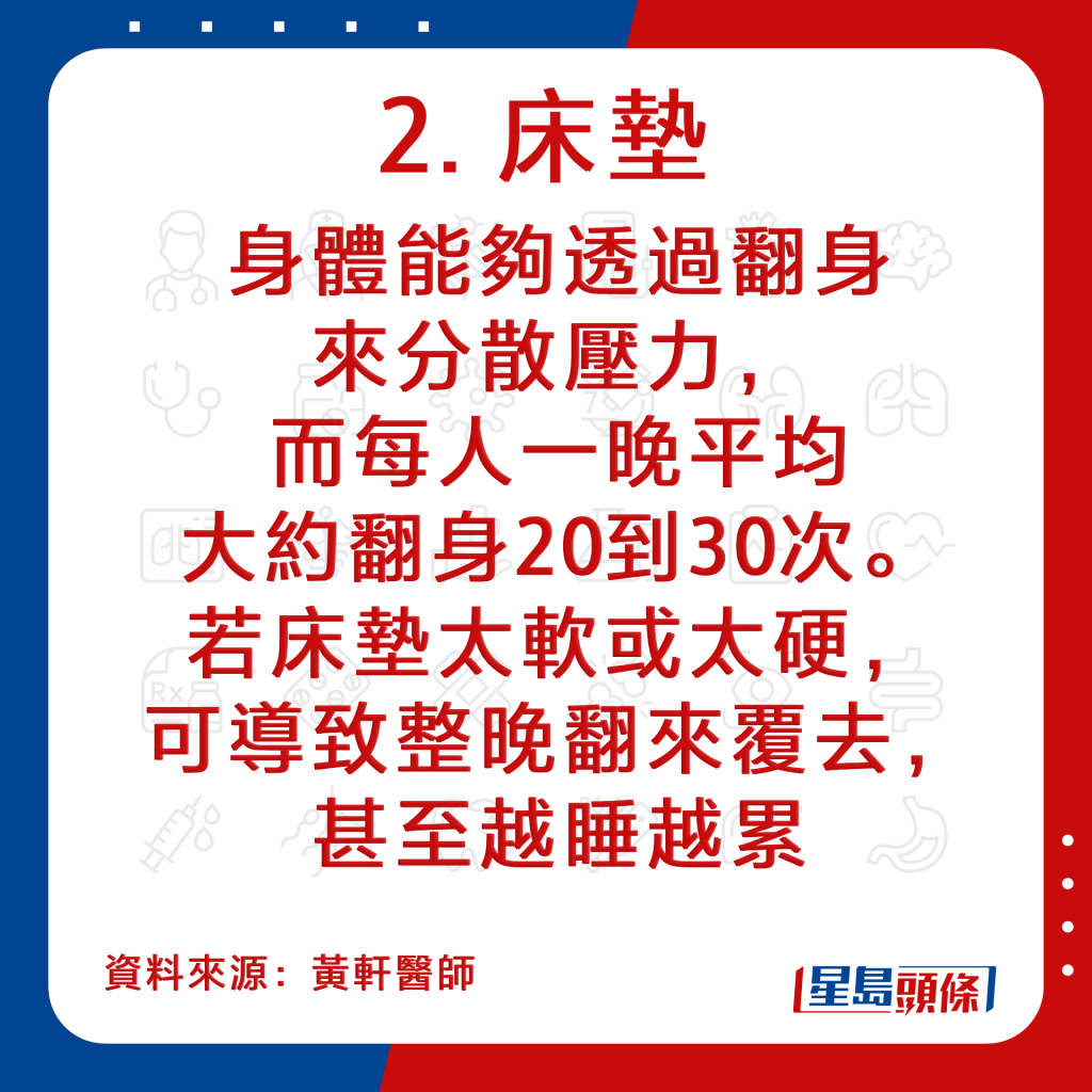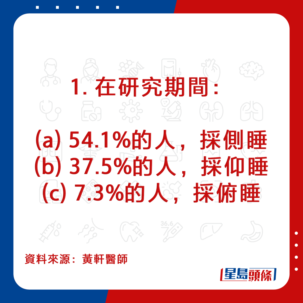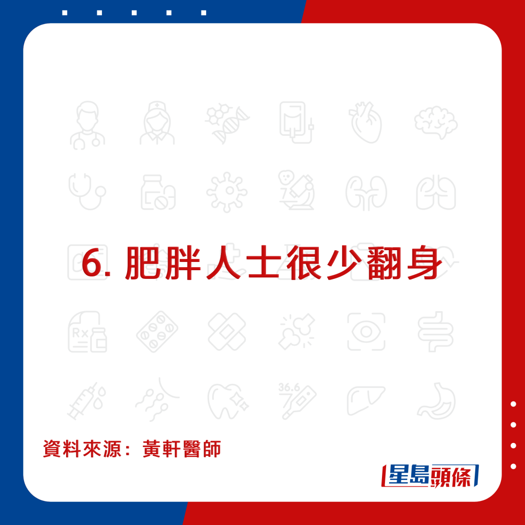 台湾重症医学专科医生黄轩早前在其Facebook专页表示,有许多与睡眠有关的研究显示,如果连续睡眠时间少于6小时,身体和精神上的伤害就会恶化,并引述挪威邦德大学睡眠专家Christian Moro指,睡眠品质不佳、睡眠时间不足等,可能是睡眠姿势不良造成。