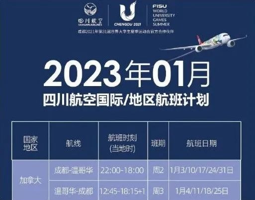 新增成都-温哥华航班,每周二起飞;