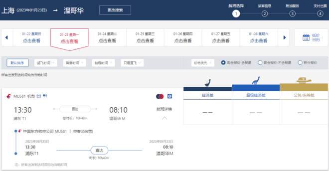 小编查到2023年1月23日上海-温哥华,有航班信息但是没有票价。