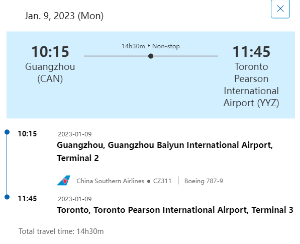 从2023年1月9日起,新增广州-多伦多的CZ311航班,每周一、四起飞;