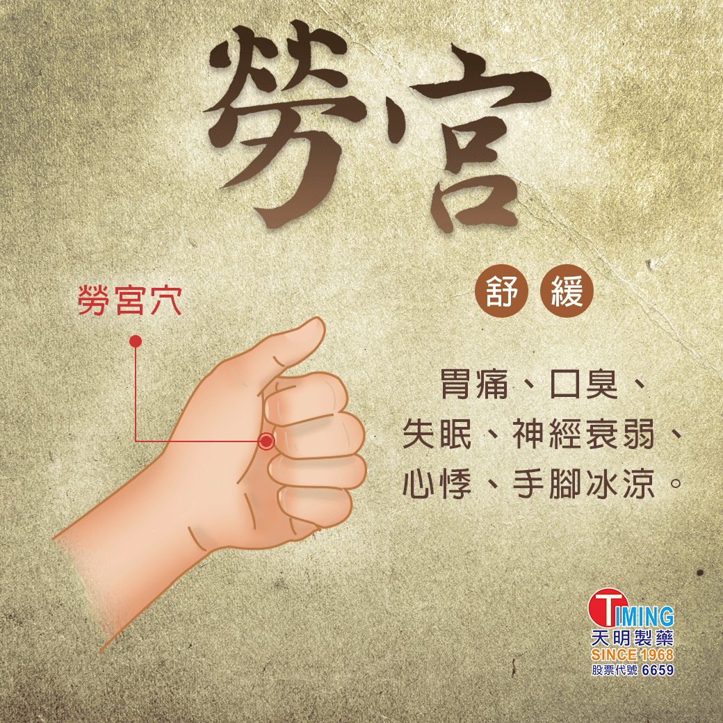 先用右手拇食指岔开,右拇指按压左手心劳宫(在掌心第二、第三掌骨之间。握拳,中指尖下便是此穴),右食指按压左手背外劳宫(在手背第二、第三掌骨之间,掌指关节后0、5寸)。