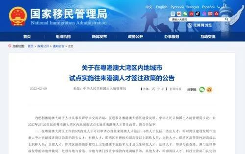 《公告》表示,为便利粤港澳大湾区人才从事科研学术交流活动,促进服务粤港澳大湾区建设发展,中华人民共和国出入境管理局决定,自2023年2月20日起在粤港澳大湾区内地城市试点实施往来港澳人才签注政策。现公告如下: