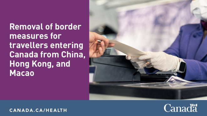 在整个 COVID-19疫情 大流行期间,为了保护加拿大人的健康和安全,加拿大政府采取了审慎、节制的应对方式来调整边境措施。2023 年 1 月 5 日,为应对在中华人民共和国出现的COVID-19激增迹象,并鉴于当时有关这些病例的可用数据有限,加拿大政府对来自中国大陆、香港或澳门地区入境加拿大的航空旅客实施了临时出发前检测要求。3月16日,加拿大政府宣布将取消这些临时措施。