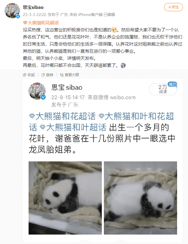 今年3月,“大熊猫和花和叶已被广东一企业认养”的话题冲上热搜,认领两只大熊猫的企业主营业务与不锈钢制品有关。/微博@思宝sibao