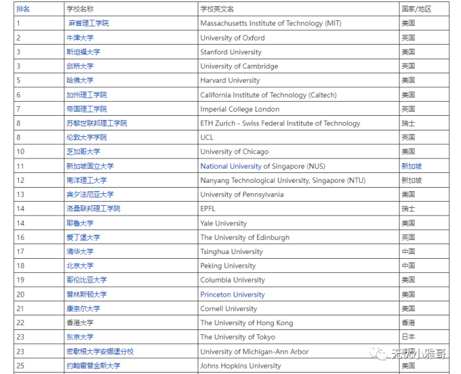我们来看一看世界前50名的高校排名: