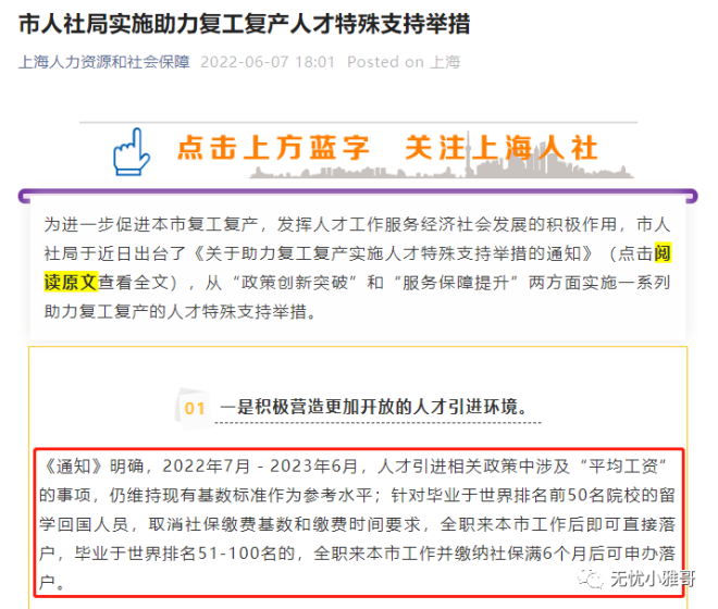 其中明确指出,从2022年7月到2023年6月,毕业于世界排名前50院校的留学回国人员,取消社保缴费基数和缴费时间的要求,全职来上海市工作后即可直接落户!