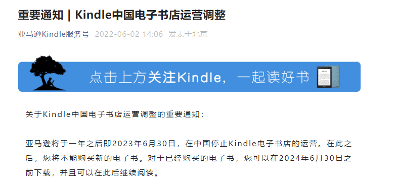 去年6月2日。亚马逊Kindle公众号发布关于Kindle中国电子书店运营调整的重要通知。