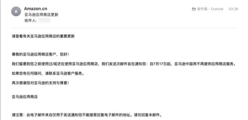 5月23日,澎湃新闻记者获悉,亚马逊应用商店发送邮件提醒称,自7月17日起,亚马逊中国将不再提供应用商店服务。
